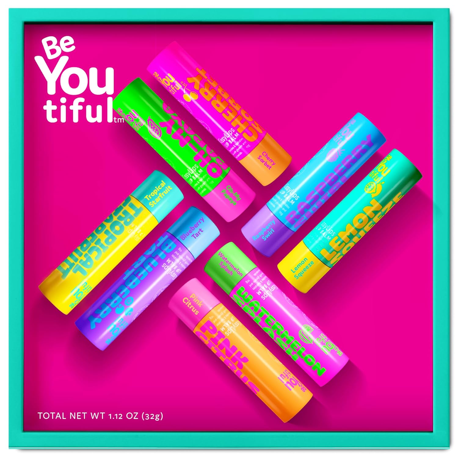BeYoutiful Skincare Natural Lip Balm Set of 8 for Teens, with Shea Butter & Vitamin E, 8 Fruity Flavors In a Gift Box, Great Stocking Stuffer Gifts for Kids Girls, Tweens and Teens
