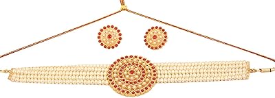 Crunchy Fashion Bollywood Style Traditional Indian Bridal Bride Wedding Bridesmaid Gold Plated Pearl Diamond Choker Necklace with Earring Jewelry Set For Women